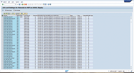 If you click the Materials with messages button in the MRP Live results screen (Figure 9), you can see exactly which materials were planned by classic MRP and the restrictions that preventing the system from planning these materials on SAP HANA. These messages are shown on Figure 10.