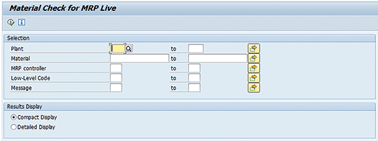 The interface of the report is displayed in Figure 11. The selection criteria are well known to anyone familiar with the MRP concept. These fields include Plant, Material, MRP controller, Low-Level Code, and Message.