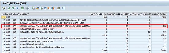 In the highlighted line of Figure 12, note that 85 materials were planned with classic MRP because the Fix and Split indicator is set on the lot-sizing procedure defined on the material master. In this case, if you want to plan these materials with MRP Live, you must use a different lot-sizing procedure.