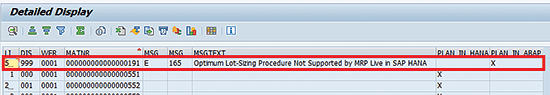 In Figure 11, if you select the Detailed Display radio button and click the execute icon, you can view a list of all the materials and their respective messages if they cannot be planned by MRP Live (Figure 13).