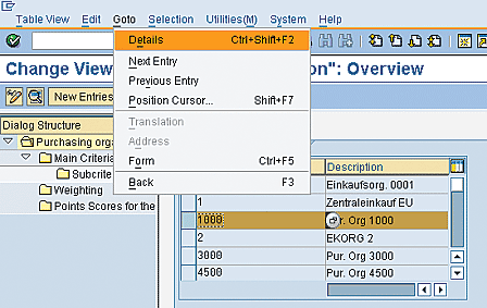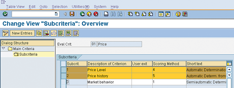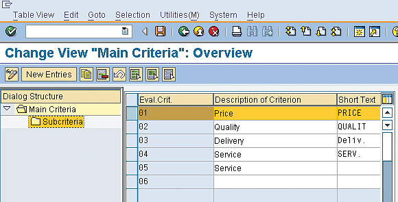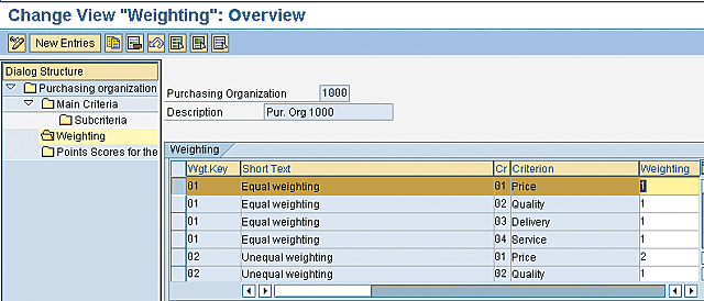 Note that before a weighting key can be used for evaluation, the criteria must have been assigned to it. In this case, the criteria were assigned to both key 01 (equal weighting) and key 02 (unequal weighting).