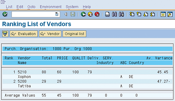 The ranking list for purchasing organization 1000 is generated after you click the execute icon (