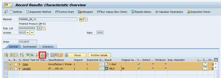 You have two different inspection characteristics in your inspection lot: color and length. Input the inspection results for both characteristics. After that, click the lock icon shown in Figure 14 to close the inspection characteristics and complete the inspection.