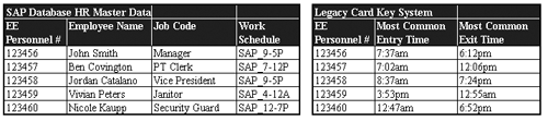 The company wants to create a report that contains data about the employee from R/3 and information about the average clock-in and clock-out times from the external card key system. Its interest is twofold: to determine if people are coded in the appropriate work schedules and to see if the employees are working when they should be.