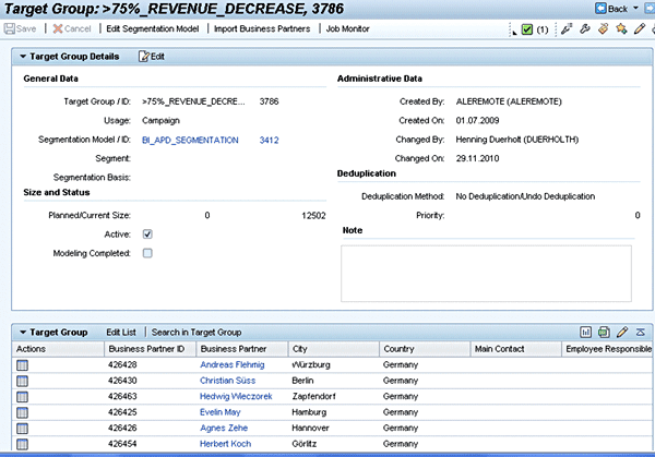 After activating and executing the analysis process, you can log on to your connected SAP CRM system and search for the target group that was just created. You can immediately use the target group for direct campaign execution or further segmentation (Figure 10).