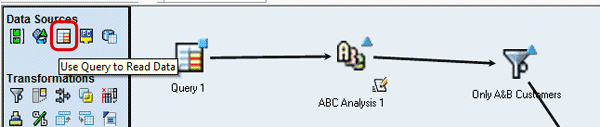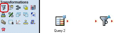 Now you have to create the necessary filter step to identify customers with a significant decrease of sales revenue (e.g., greater than 75 percent). Click the filter icon in the Transformations section of the screen shown in Figure 2 and drag it into your maintenance screen. As this is a follow-up to the data retrieval within the previously-defined data source element, the filtering has to be linked to the previous step as a postprocessor. You can do this by clicking the right arrow icon of the query element and dragging that to the left arrow of the filter element (Figure 4).