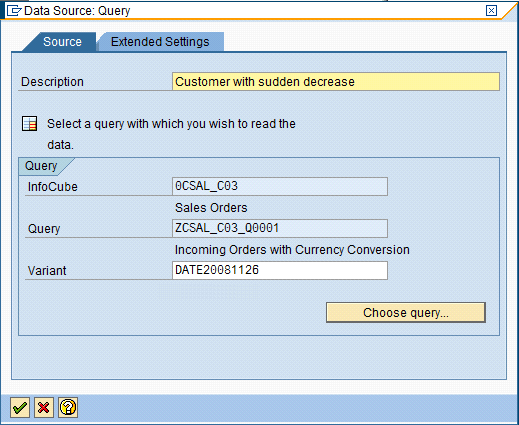 Enter a name for the data source (e.g., Customer with sudden decrease) and enter the relevant query object (Figure 3). The entry for the InfoCube is automatically determined based on the query you choose. If required, you can also add a variant for the query in the Variant field. Confirm your entries by clicking the green check mark icon.