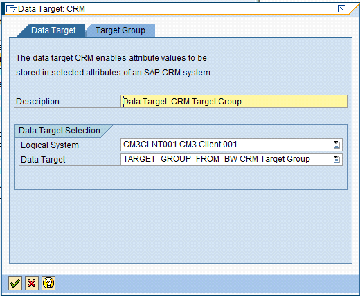 Now you have to define the data target in the SAP CRM system. Double-click the corresponding icon of the created data target in APD and a maintenance screen for the attributes appears. Enter a description and select the logical system to which the data should be written (Figure 8). Because the value should be used for a campaign, we also selected the data target TARGET_GROUP_FROM_BW CRM Target Group.