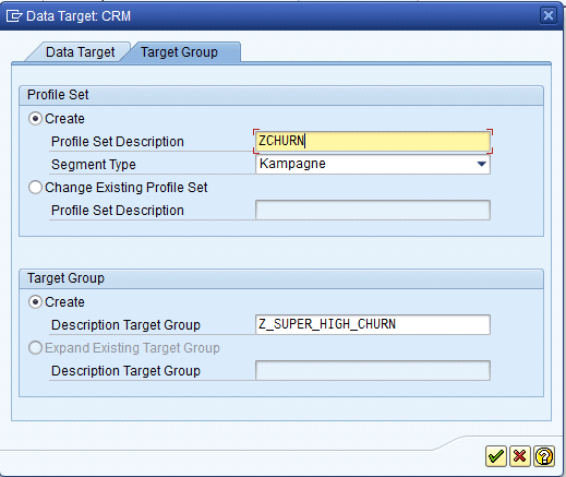 The last step is to define the technical name and segment type for the profile set. You want to create a new target group, so select the corresponding option on the Target Group tab and enter a new ID (e.g., Z_SUPER_HIGH_CHURN in our example) and the corresponding SAP CRM profile set (Figure 9). The technical name helps you identify your objects in SAP CRM.