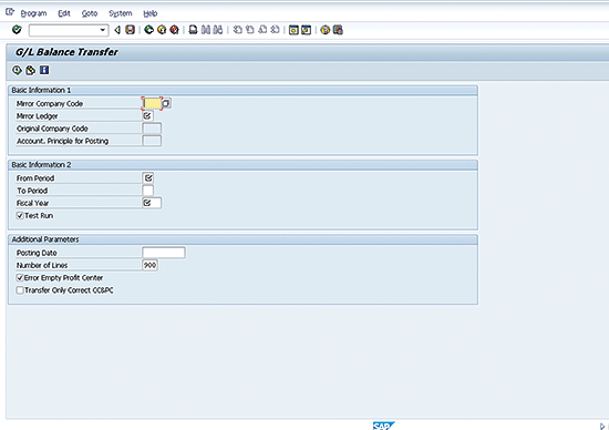 Once the MCC is entered, many of the other fields default. The fields for period, year, and posting date must be populated for each run. The Number of Lines limitation is used to avoid overflow of the 999 line limit. The alternative fiscal year financial statements include the alternative asset G/L accounts and exclude the original accounts. Special consideration must be taken for retained earnings (RE) because the year-end process updates RE and includes relevant profit and loss (P&L) accounts (some of which are duplicated as part of the G/L Balance Transfer).