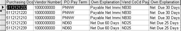 In this example, vendor 1000000000 has a vendor payment term of PNNW, which tells the system to pay a valid vendor invoice immediately. The payment terms per the vendor master record at the company code level are NB30, which stands for pay invoice net 30 days after the invoice is received. Discrepancies like the ones noted above require follow up, but the query result gives you a headstart on shoring up a key control objective.