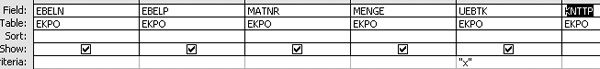 Because you performed steps 6 through 9, you know this flag is maintained in table EKPO (PO line item) and the technical field UEBTK. Designing a forensic audit query against EKPO, such as the one shown in Figure 22, helps you to identify all PO line items that have the Unlimited over delivery flag set (i.e., an X in the field). If field UEBTK has an X in it, the Unlimited over delivery flag is set for the PO line item. Executing the query in Figure 22 yields the results shown in Figure 23.