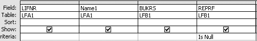 After downloading and importing the vendor master data into Access, the forensic audit query shown in Figure 24 is designed to verify if the duplicate vendor invoice flag is set for all vendors. The Is Null value in the criteria line identifies those records that do not have a value in the field REPRF (check double invoice). The query identifies several vendors that do not check for duplicate invoices, as shown in Figure 25.