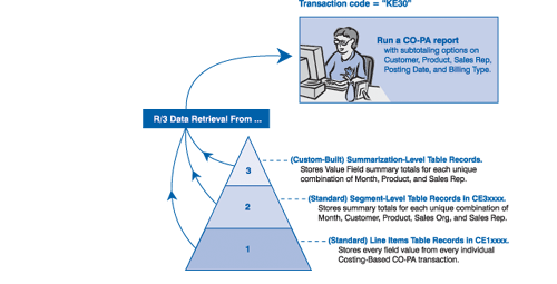 Summarization levels are special summary tables that contain only the specific characteristics that are needed by your report(s). The concept behind summarization levels is to offer you a chance to increase performance by adding one or more layers onto the data retrieval pyramid that CO-PA’s report program is going to use when executing your reports.
