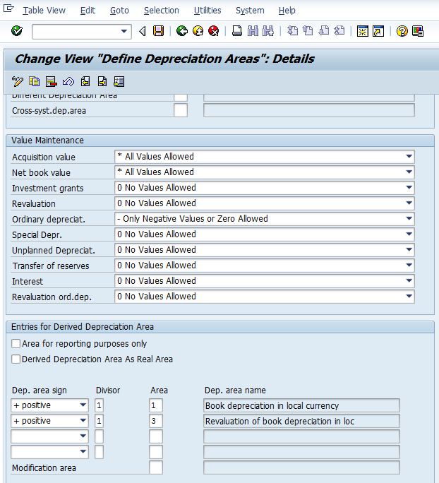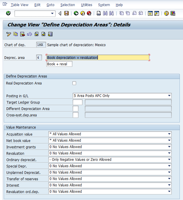 In the Value Maintenance section, go to the Revaluation field and select * All Values Allowed from the drop-down list of options. In the Revaluation ord.dep and Net book value fields, select * All Values Allowed from the drop-down list of options. Click the save icon to save your entries.