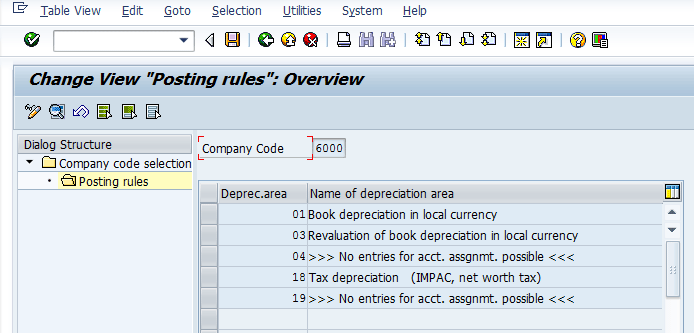 To configure a posting rule, follow menu path Financial Accounting > Asset Accounting > Special Valuation > Revaluation of Fixed Assets > Revaluation for Balance Sheet > Inflation Accounting > Revaluation Area > Maintain Posting Rules (Figure 7). Select company code 6000 by placing your cursor on this code and clicking your mouse. Figure 7 shows that company code 6000 is selected (highlighted) for posting the rules configuration.