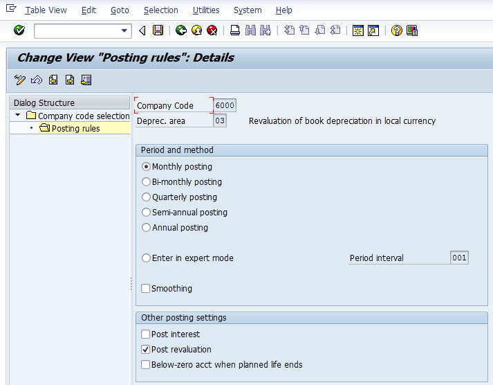 The next task is to configure posting rules for company code and revaluation area 3, which means the frequency at which the system posts the revaluation amounts from any given revaluation area to the general ledger. When the depreciation run is executed, the SAP system posts revaluation amounts to the general ledger along with the depreciation amounts. I explain the detail of postings of depreciation and revaluation to the general ledger later.