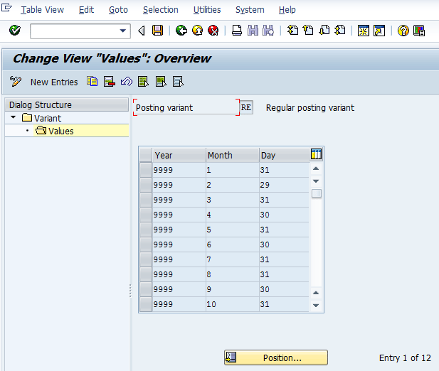 To configure posting variant RE, follow menu path Financial Accounting > Asset Accounting > Special Valuation > Revaluation of Fixed Assets > Revaluation for Balance Sheet > Inflation Accounting > Maintain Posting Variants. This path takes you to the screen shown in Figure 10. Click the New Entries button and then enter RE in the Posting variant field and Regular posting variant as a description. Click the Values folder and on the lower right side of the screen, enter values in the fields under the Year, Month, and Day column headings as shown in Figure 10. Click the save icon to save the posting variant RE.