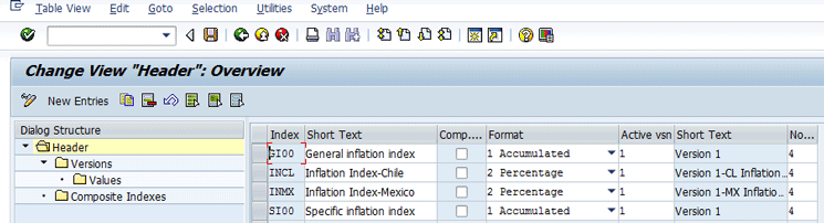 After you configure the posting variant, you need to configure the inflation index. The inflation index is the basis for revaluation. To configure the inflation index, follow menu path Financial Accounting > Asset Accounting > Special Valuation > Revaluation of Fixed Assets > Revaluation for Balance Sheet > Inflation Accounting > Maintain Inflation Index. Figure 11 shows four inflation indices and the INMX inflation index configured for explanation of inflation-based revaluation.