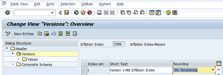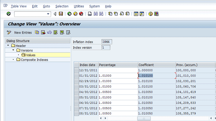 Select the version and double-click the Values folder to enter the inflation index. INMX inflation index values are specified for the first eight months of the year 2012 for this example as shown in Figure 13. Index values for INMX are specified in percentages, and the system itself calculates the accumulated values based on the percentage specified.