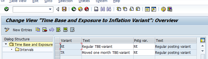You can specify the TBE to inflation variant keys. RE and TR are the names that I use in my example. These names are not delivered by SAP. I use RE (regular) as the TBE variant dates match posting variant RE. TR is another TBE variant. I use the TR key to signify transfer of dates. TBE variant TR dates are one month behind the RE date (i.e., the previous month).