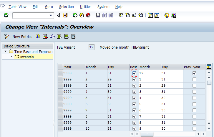 Figure 16 shows another TBE configured to the inflation variant that is set up to revalue a fixed asset by taking the previous period’s inflation index into account. To display this screen, select the TR variant in Figure 14 and double-click the Intervals folder.  If you use the TR TBE for the inflation variant, the inflation revaluation run for January 2012 would consider assets posted in January 2012 as the December 2011 inflation index considered for revaluation of assets. Therefore, based on the specific requirement for revaluation, you can configure the TBE to the inflation variant.