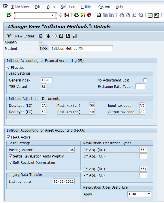 This action opens the screen shown in Figure 18. In this screen I assign inflation index INMX, posting variant RE, and TBE variant RE to inflation method INMX. To do this, populate the fields shown in Figure 18.