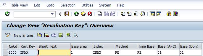 In Figure 20, enter INMX in the fields under the Rev. Key and Index columns. Enter RE in the fields under the Method and Time Base columns. In the fields under Base (APC [acquisition and production cost]) and Base (Dpn [depreciation]), enter 01 for the acquisition value and base depreciation values, respectively. Click the save icon to save your entries.