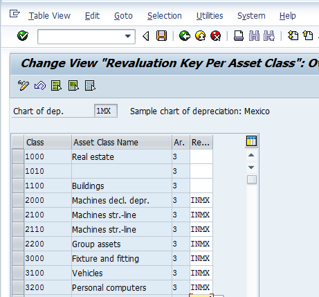 Revaluation keys are assigned to the asset class so that the revaluation key defaults in the asset created with the asset class. In my example, I assign the revaluation key with the asset classes for chart of depreciation 1MX. To do this, follow menu path Financial Accounting > Asset Accounting > Special Valuation > Revaluation of Fixed Assets > Revaluation for Balance Sheet > Inflation Accounting > Revaluation Key >Assign Revaluation Key to the Asset Classes.