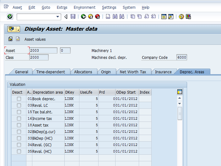 Areas 34 and 35 are parallel currency areas for area 3. Depreciation areas 34 and 35 are created for tracking valuation in parallel currency USD and can be ignored for this example. SAP always posts zero amounts to parallel currency areas such as areas 34 and 35 as inflation is specific to the local currency. However, parallel currency areas like 34 and 35 need to be created as area 3 posts to the general ledger.Â