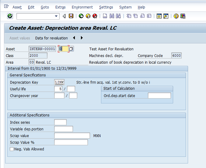 For my example, a chart of depreciation 1MX (for Mexico) is configured for explaining inflation-based revaluation. To complete this configuration, execute transaction code OAOB and follow IMG menu path Accounting  > Asset Accounting > Organizational Structures > Assign Chart of Depreciation to Company Code . This action displays the screen shown in Figure 1. In this screen, a fixed asset for company code 6000 fixed assets is used for explaining SAP system transactions and master data setup.