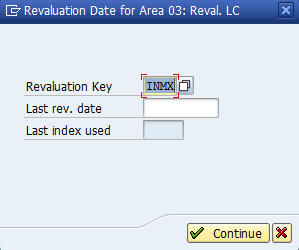 This action opens a screen that displays the revaluation-related fields for depreciation area 03 for this asset (Figure 28). Revaluation Key INMX is defaulting from the configuration of revaluation key assignment to asset classes (as shown Figure 21). Click the Continue button. Asset number 2005 is now created.
