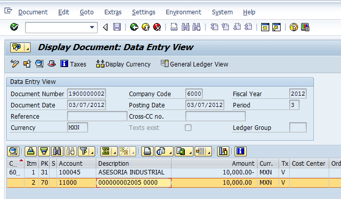 After asset 2005 is created, it needs to be posted for an acquisition cost of MXN 10,000 as of March 7, 2012, as shown in Figure 29 (vendor invoice posted for asset acquisition). To complete this step, execute transaction code FB03. In the Keys for Entry View section of the Display Document initial screen (not shown), enter 1900000002 in the Document Number field, 6,000 in the Company Code field, and 2012 in the Fiscal Year field. Click the green check mark icon to display the document (Figure 29). Notice that initial acquisition value of the asset is MXN 10,000.