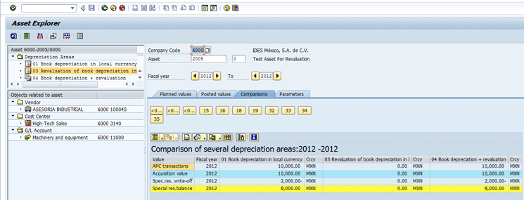 Figure 30 displays the asset values prior to revaluation run for all three depreciation areas of interest (book area 01, revaluation area 03, and area 04). The asset 2004 values for area 03 are zeroes as no revaluation is posted. For area 01, the asset acquisition value is MXN 10,000, and accumulated depreciation value is MXN 2000.