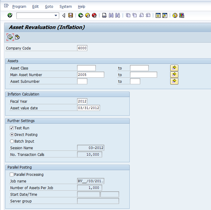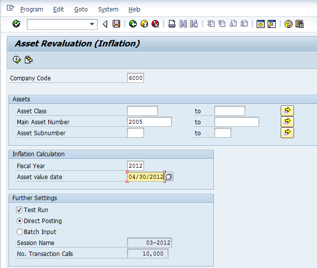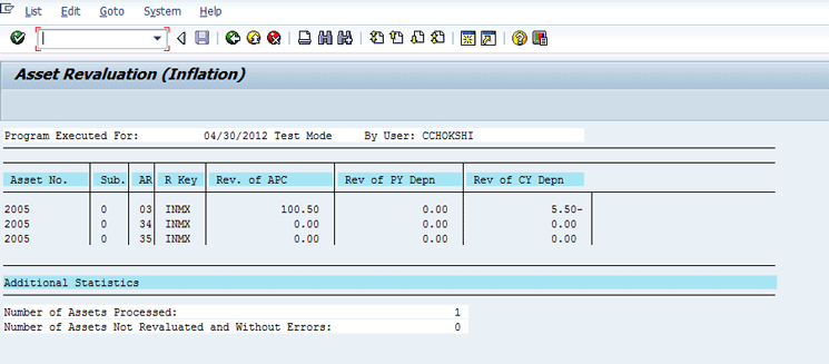 Now, you need to execute inflation-based revaluation for the next interval (i.e., as of the asset value date of April 30, 2012). First, execute the revaluation run in test mode. To do this, execute transaction code J1AI and follow menu path Financial Accounting > Fixed Asset > Periodic Processing > Revaluation for Balance Sheet > Inflation.