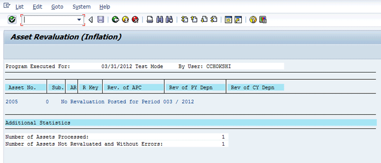 The revaluation run is executed first for the asset value date of March 31, 2012, as shown in Figure 31. Because the TBE variant RE is assigned to revaluation key INMX, there should not be any revaluation for the asset 2005 (as explained for the TBE variant). Figure 32 shows the report output of the inflation-based revaluation run that states that no revaluation was posted for period 003/2012 for asset 2005.