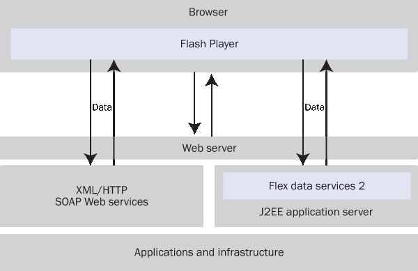 The development process for Flex applications is similar to that used in other object-oriented environments such as Java and C++. Using Flex Builder or a text editor, you can write source code, which is then compiled to bytecode. These bytecode files extension are SWF (stands for Shockwave Flash) and known as flash files. Users then deploy these files to a Web server just as they would an HTML file or an image. When the flash file is requested by a browser, it is downloaded and the byte code is executed by the Flash Player runtime available with the browser. Flash files execution inside the Flash Player allows users to interact with applications and perform various operations. It can even the generate SOAP, HTTP, or AMF requests to connect back to the server. The typical runtime Flex architecture is shown in
