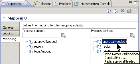 Here is how it works: Right-click the Mapping activity and choose Properties from the context menu. The Properties tab opens beneath your process model — here, click Mapping. What you see is the mapping editor displaying your process context on both sides (Figure 7).