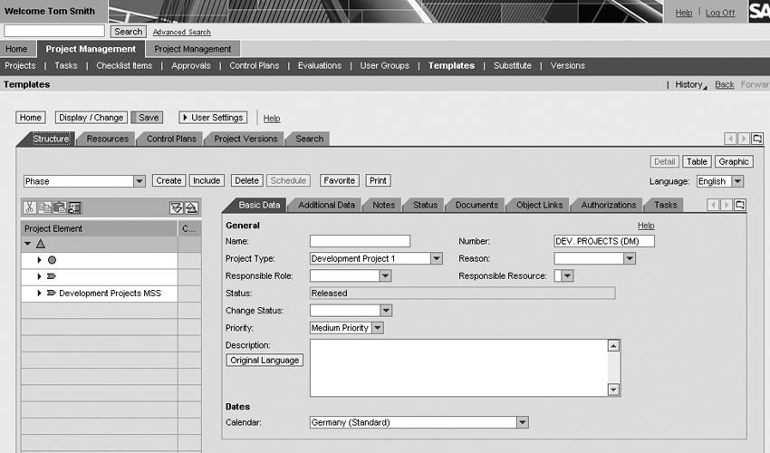 I used a template, shown in Figure 2, to prefill many of the fields in the project. The alternative way to create a project is to call cProjects from one of the roles predelivered as business content for the SAP NetWeaver Portal. In mySAP ERP 2005, the roles Project Self-Service and Manager Self-Service include a Create project function that starts a wizard to guide the occasional user through the set-up. Again, you can use a template to prefill many of the fields.