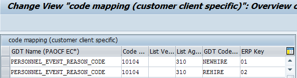 The GDT name determines which data types are being mapped. If you have defined custom fields or use different external codes than what were delivered in Employee Central or in SAP ERP HCM, you must use table PAOCFEC_MAP_CC for your custom mapping. You can find the entire standard code mapping from Employee Central to SAP ERP HCM in table PAOCFEC_MAP. (Refer to the latest Employee Central Payroll Implementation Handbook for more details on mapping entries; log-in required.)
