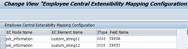 Using extensibility, you can map Employee Central custom fields to SAP ERP HCM infotypes. You can map custom fields from the Job Info, Personal Info, and Comp Info fields to infotypes 0001, 0002, 0007, and 0008, respectively, in table PAOCF_EXTMAP.