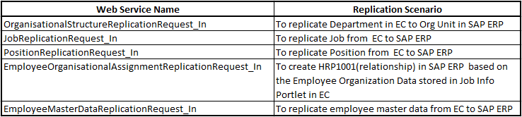 You must activate the required web services in the SAP ERP HCM system to communicate and receive data from Employee Central. The web services should be activated to complete the PA (employee master data) and OM (organizational unit, job, position, and relationship) processes in SAP ERP HCM. A list of the required web services is shown in Table 1.