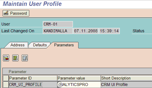 Then you need to add the CRM WebClient UI profile to your user. Use menu path System > User Profile > Own data. Click the Profile tab, and then click the Parameters tab to add the data shown in Figure 2.