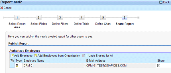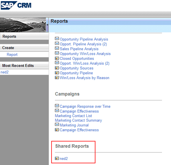 In the last step in the wizard, Share Report, you distribute the report (Figure 6). I shared the report by person, but I could share it by finding users that are connected to a CRM organizational unit. Once shared, the users see the report in a work center link group called Shared Reports (Figure 7).