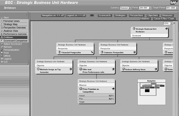 Add the application to an existing portal role or create a dedicated portal role for it using a standard portal administration procedure. Finally, make sure the system assigns the roles containing the application to the portal user IDs of the respective end users who are supposed to use it. SAP integrated the portal technology seamlessly with the SEM back end, and the system passes the logged-on end users’ log-on tickets to the portal using the Best Practice Scorecarding application to SEM via Single Sign-On (SSO). The system performs authorization checks in SEM to avoid unauthorized access to the sensitive, strategy-related information. Also, make sure end users specify their respective personal scorecard using the personalization function of SEM-CPM as a Web application before using the portal application.