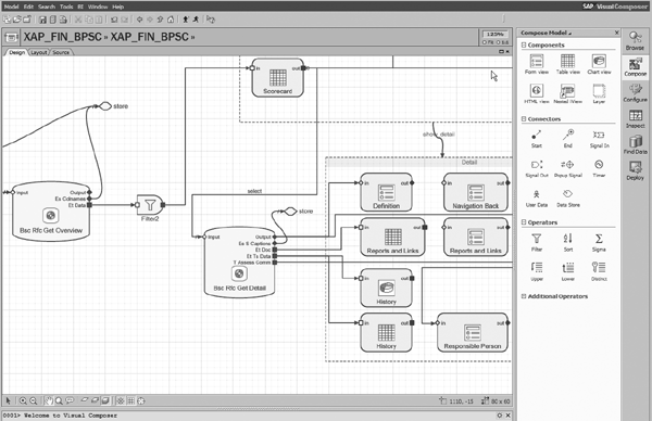 Visual Composer, delivered as part of SAP NetWeaver, is a visual design tool that enables business process experts to create model-driven applications without having to write code manually. It is part of SAP NetWeaver Portal and helps generate portal applications called iViews that contain contents such as tables, charts, or actionable buttons. These integrate with SAP NetWeaver Business Intelligence (SAP NetWeaver BI), mySAP ERP, R/3, Customer Relationship Management (CRM), Supply Chain Management (SCM), as well as non-SAP sources via Java Database Connectivity (JDBC) and Object Linking and Embedding Database for Online Analytical Processing (ODBO). The resulting portal applications use advanced visualization technologies including Adobe Flex or Web Dynpro in runtime. Setting up an analytical application using Visual Composer consists of dragging and dropping appropriate objects and establishing relationships between them using a mouse instead of programming.