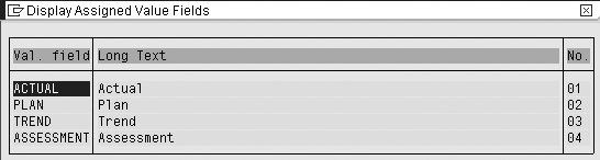 The Val. field and Long Text attributes in the value field assignment transaction in SEM are not important for the first two rows (Position 01: Actual, Position 02: Plan). The data services enabling Best Practice Scorecarding may run correctly even if the long text labels and technical names of these value fields are customer defined. It is only important the standard Trend and Assessment value fields are assigned to Position 03 and 04, respectively, for the Visual Composed model to run without modifications.