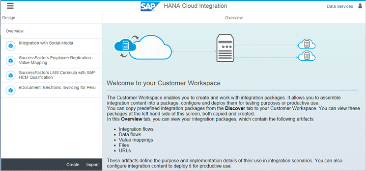 The Design area workspace of a company-specific tenant of SAP HCI