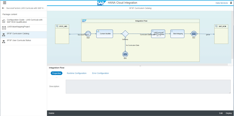 Select the integration package SuccessFactors LMS Curricula with the SAP HCM Qualification that you copied before. That takes you to Figure 5. Choose the integration flow by clicking the SFSF Curriculum Catalog on the left of the screen in Figure 5. This synchronizes the Curriculum Catalogue in order to integrate the learning successes from SuccessFactors LMS to the on-premise SAP ERP HCM system.