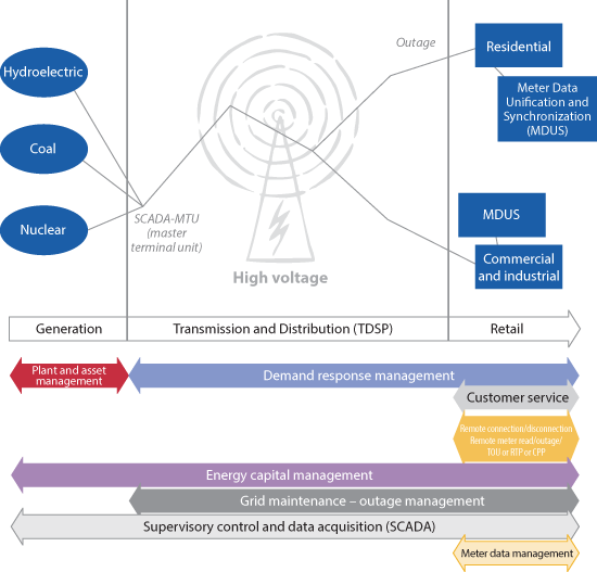 Figure 1 shows the components of a smart grid mapped to the value chain of generation, transmission and distribution, and retail. You can see the key solutions required for enabling a smart grid are spread across the entire value chain within the electricity industry. Both regulated and deregulated industries require solutions mapped to their capabilities.
